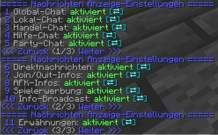 Außerdem kannst du mit dem Befehl /chat ein Menü öffnen in dem du die verschiedenen Chats mithilfe der Pfeilsymbole aus- und einschalten kannst.