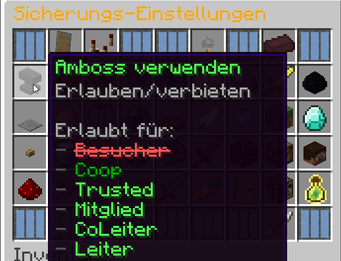 | Trusted | /is team trust | Diese Gruppe stellt eine Erweiterung der Coop-Gruppe dar. Im Gegensatz zu jener behält der Promotete die gegebenen Rechte so lange, bis du ihn händisch per /is team untrust entfernst oder ihm die Coop-Rolle zuweist. Der Promotete behält auch hier seine eigene Insel, kann bei dir aber auch dann mitwirken, wenn du offline bist. |