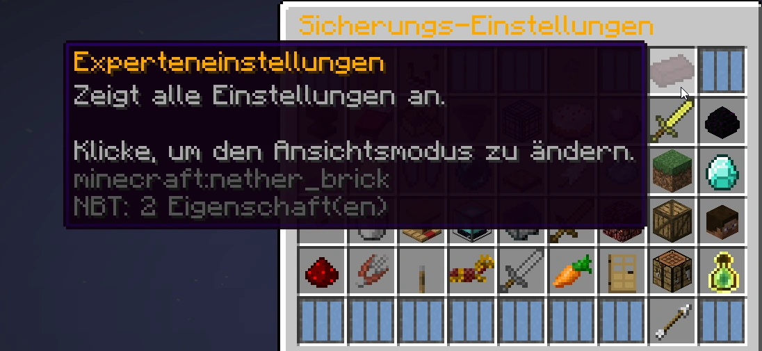 - Tom kann die Reichweite in 1er- (Nugget), 5er- (Barren) oder 20er- (Block) Schritten ändern. Zum Erhöhen der Reichweite klickt Tom auf die jeweiligen Gold-Items, zum Verringern auf die jeweiligen Eisen-Items. Die aktuell eingestellte Reichweite wird angezeigt, wenn Tom über den Netherstern hovert.